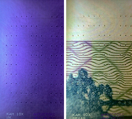 т. е. след деформации бумаги. - Микроперфорация. В данном режиме удобно проверять данный защитный признак, поскольку в ИК диапазоне лучше видны фаски вокруг отверстий, а также отсутствие рельефа.