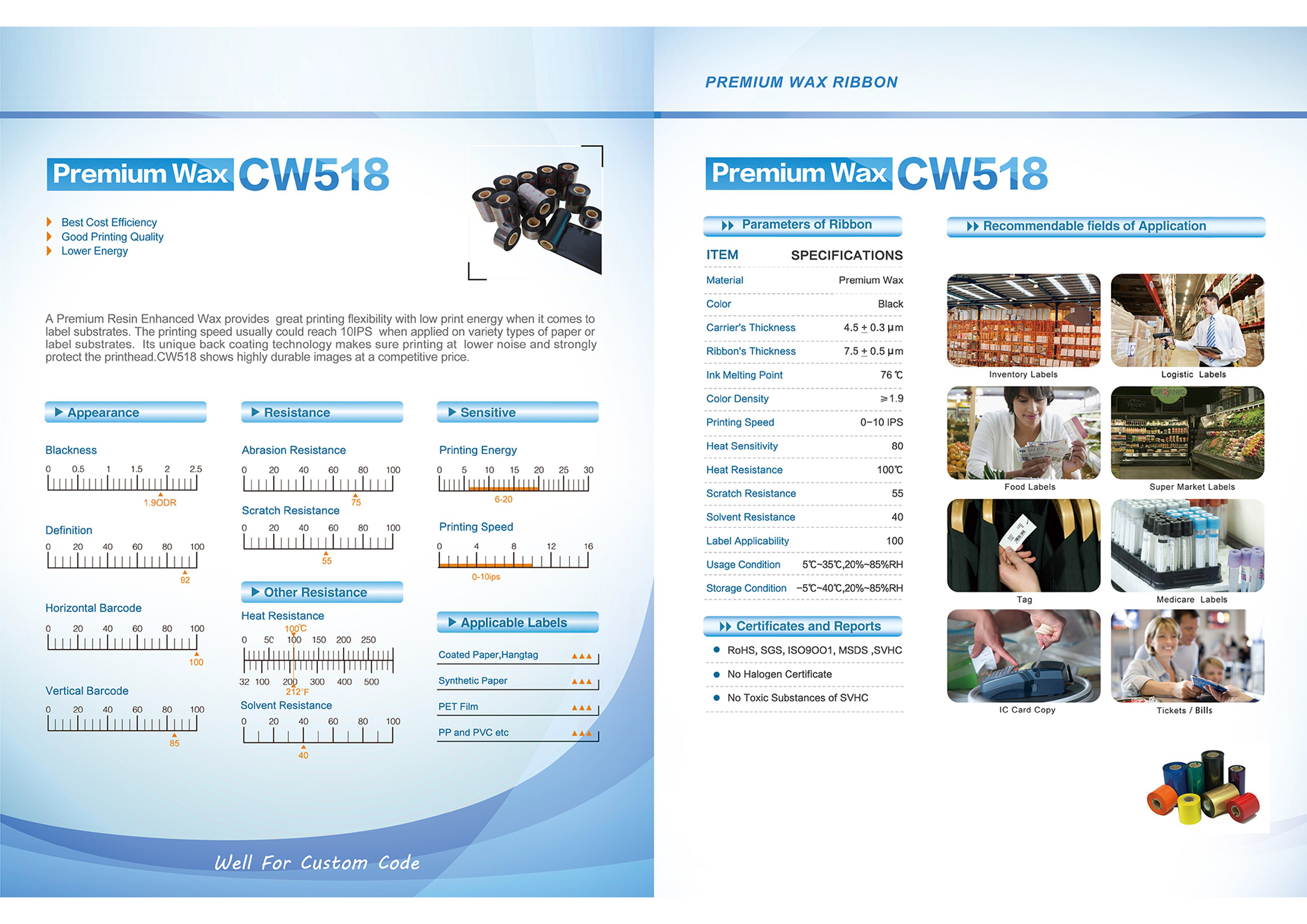 Риббон PS Premium WAX - это разновидность восковой ленты премиум-класса, которая является разработкой компании ООО «Маркет». Она обладает преимуществами низкотемпературной печати и хорошей адаптацией. Скорость печати может достигать 10 точек на дюйм. Устойчивость к царапинам у наших риббонов выше, чем у большинства продуктов на рынке. Мы используем технологию многокомпонентного покрытия и пленку с высокой равномерностью нанесения, которая снижает уровень шума при печати и защищает печатающую головку.