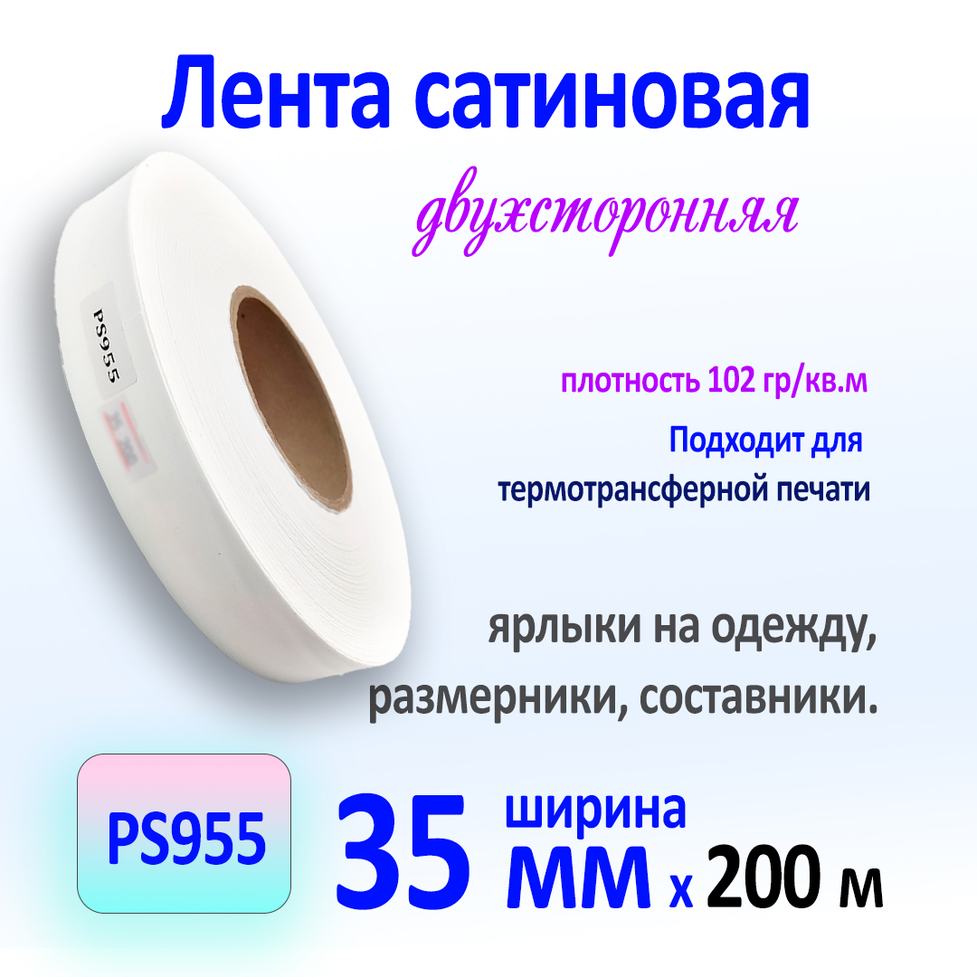 PS955 - матовая белая двухсторонняя лента из материала с меньшим блеском, чем стандартный сатин. Подходит для всех видов печати, включая термо-трансферную.