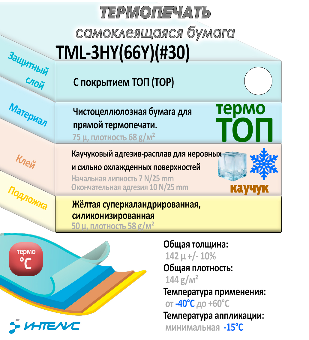Бумага термочувствительная ТОП (TOP), желтая подложка, каучуковый клей глубокой заморозки, температура применения -40С +50С
