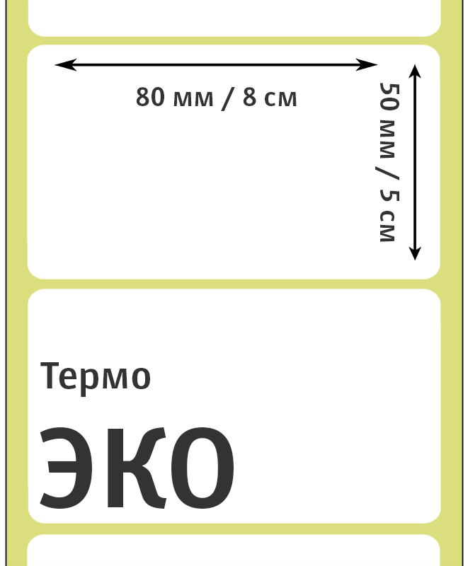 Печать термоэтикеток 80х50 мм осуществляется путем прямого нагрева выборочных точек движущейся этикетки термопечатающей головкой принтера. Термоэтикетки 80x50 мм применяются для печати непосредственно на производстве и упаковке продуктов питания и промышленных товаров, в супермаркетах на автоматических этикеточных весах и т.д.